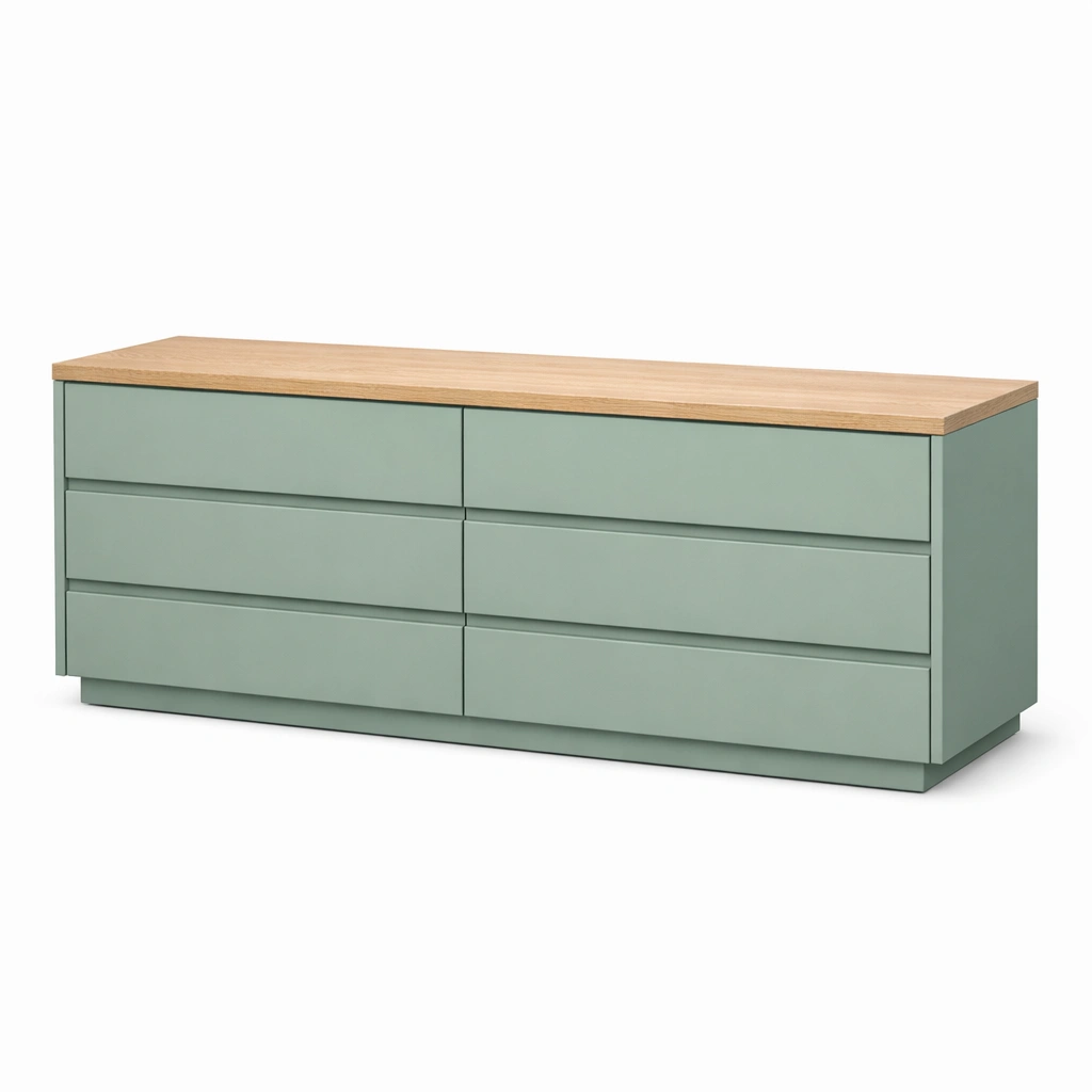 Esta cajonera está hecha de MDF con una superficie superior de chapa de roble. Cuenta con seis cajones para almacenamiento.