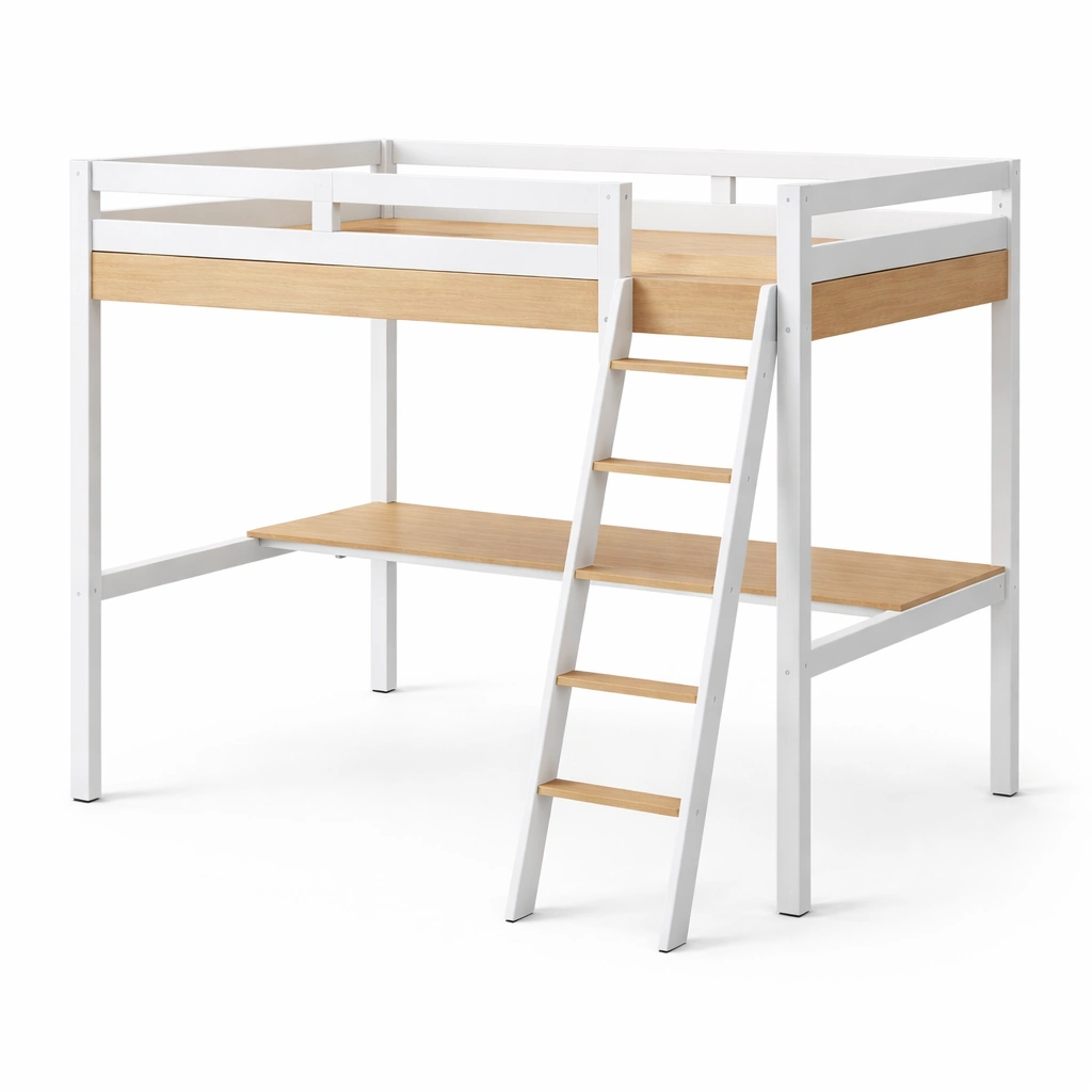 Características: Litera alta con escalera frontal fija y escritorio integrado.