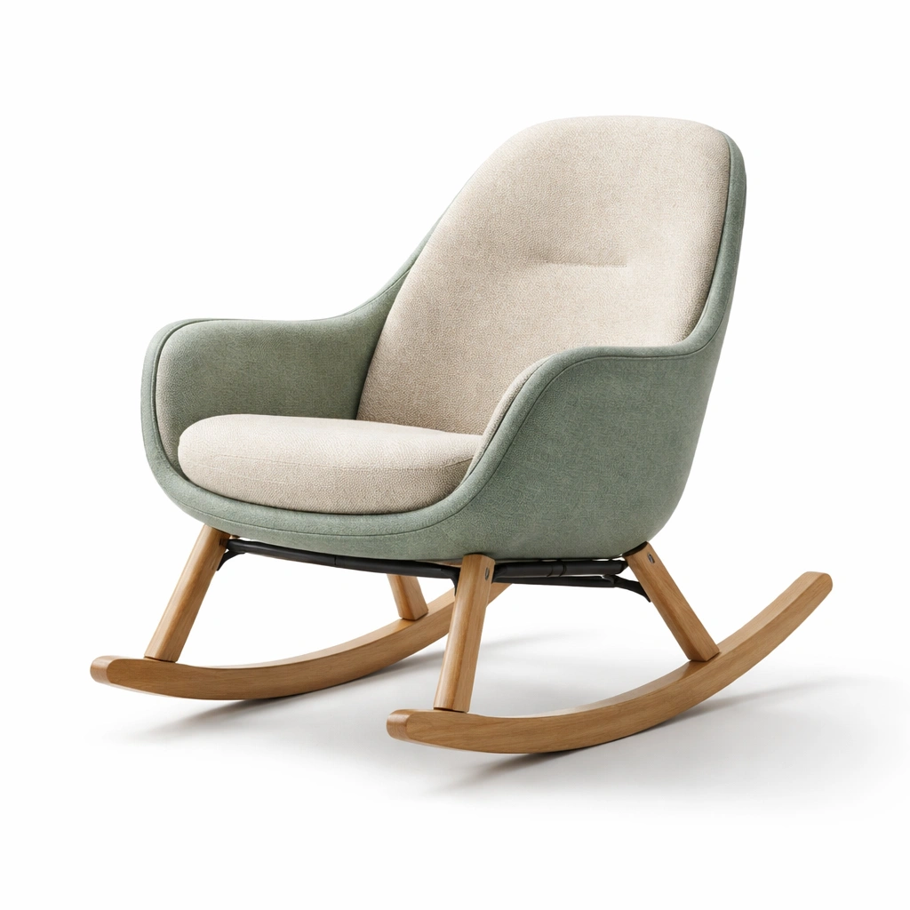 Silla mecedora de madera con tapizado de poliester beige y verde