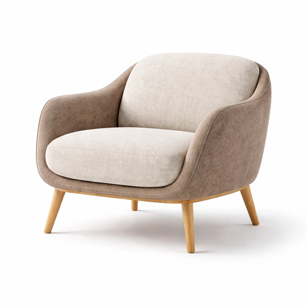 Este sillón cuenta con un tapizado de tela de poliéster en colores beige y marrón. El relleno está compuesto de espuma de alta densidad. Las patas son de madera de roble, brindando estabilidad y un acabado natural.