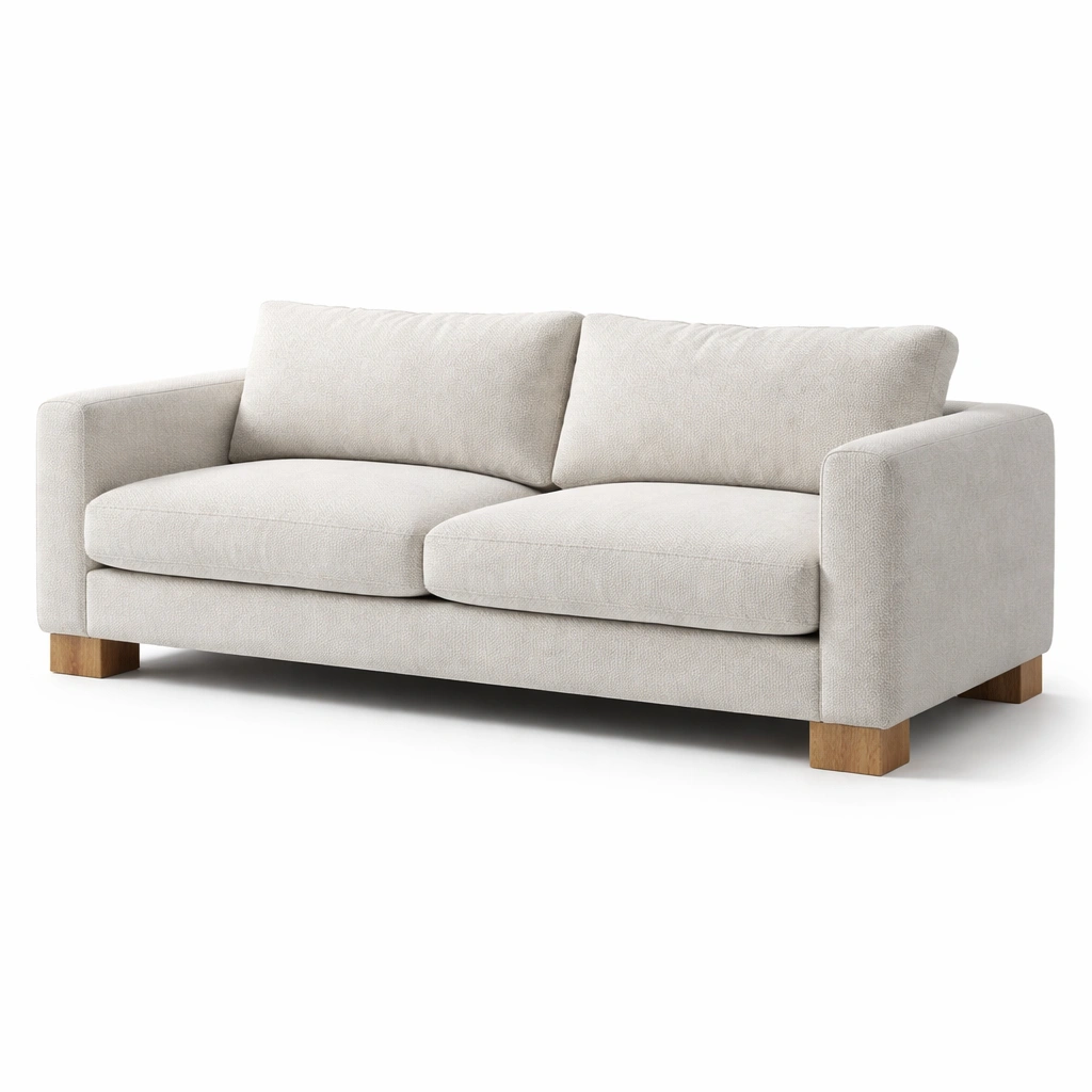 Sofá de tres plazas con estructura de madera maciza y tapizado en lino de color beige.